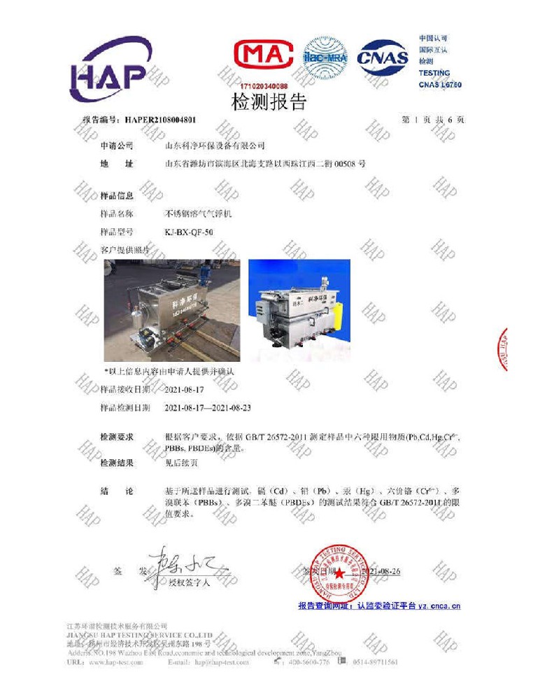 不銹鋼溶氣氣浮機(jī)檢測報(bào)告