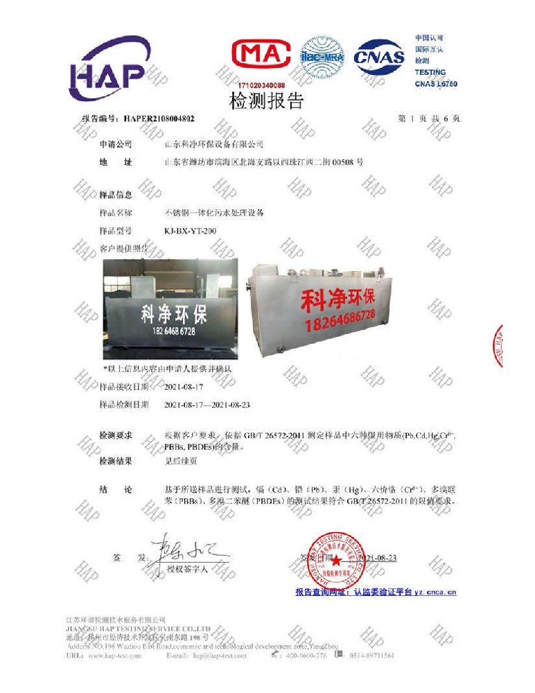 不銹鋼一體化污水處理設(shè)備檢測(cè)報(bào)告