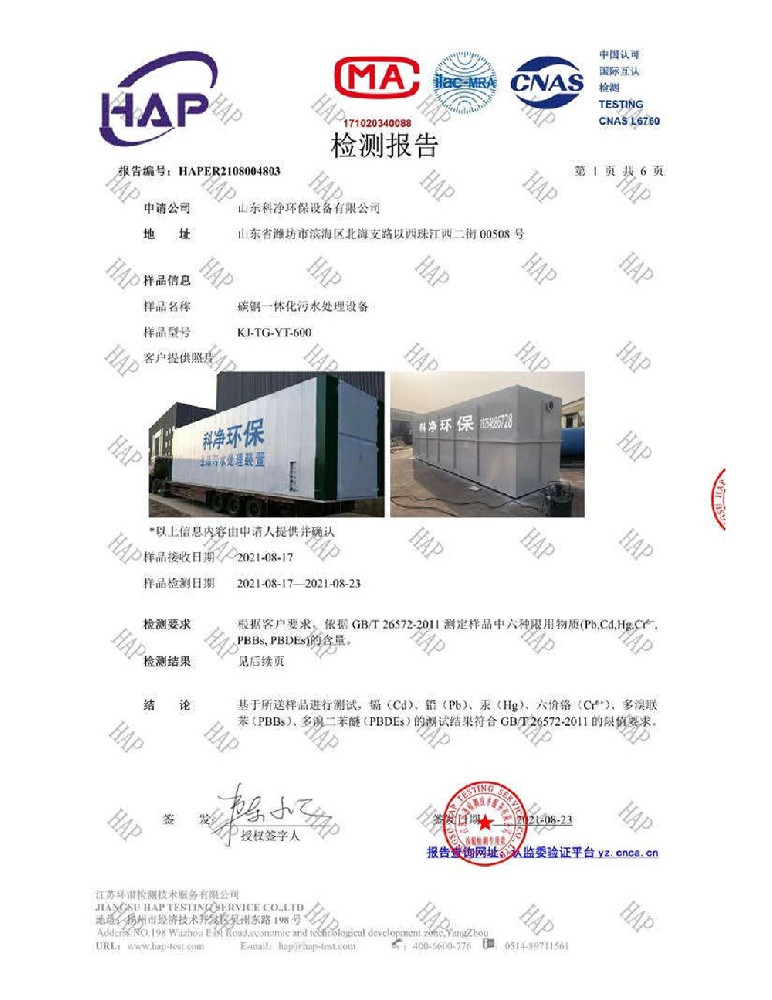 碳鋼一體化污水處理設(shè)備檢測報(bào)告